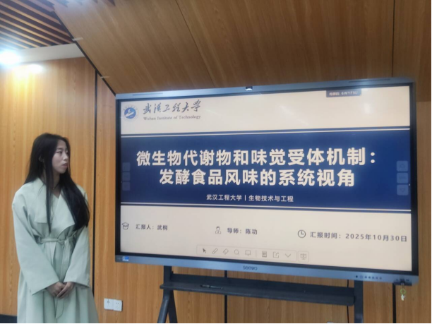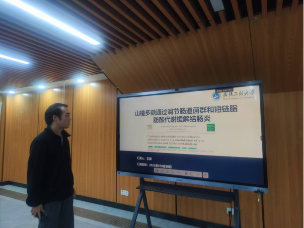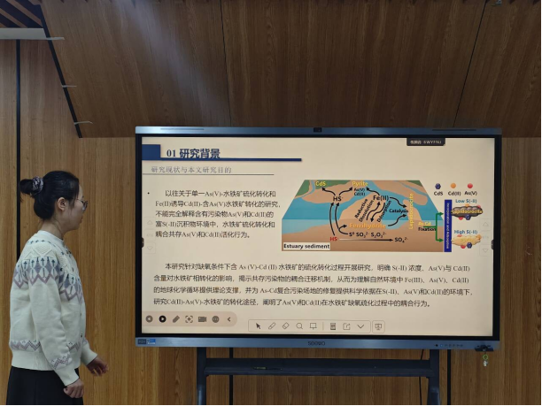 会上,六位研究生依次登台,围绕水铁矿污染治理、微生物发酵食品、土壤重金属污染、山楂多糖缓解结肠炎、河流温室气体排放等领域,就个人研究方向、研究成果、及相关专业权威文献进行了分享。他们的报告内容丰富详实、观点新颖独到、逻辑严谨周密,赢得了在场师生的阵阵掌声。
