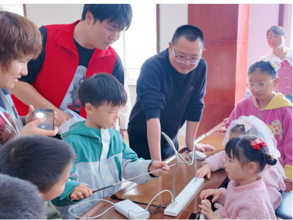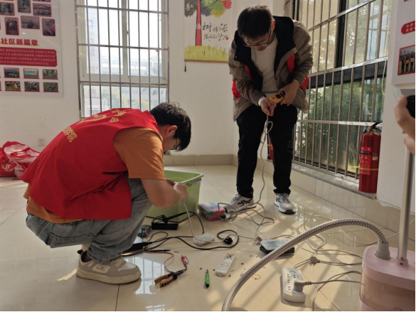 电气信息学院志愿者殷向阳开展“走进神奇的电世界”安全用电科普课堂。他讲解了家庭用电安全常识、触电防护与应急处理等实用知识,通过趣味满满的“铁环过电圈”互动小游戏引导小朋友们在玩乐中了解用电知识,揭开电力科学的神秘面纱。随后,志愿者们在社区设立服务点,面向社区居民开展义务电器维修志愿服务,细心检查居民送来的各类小家电,认真排查故障、耐心维修养护,将便民服务落到实处。